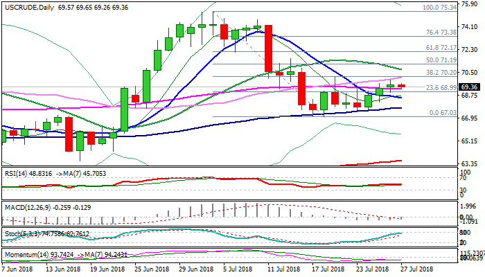 Thursday’s eventual break above 55SMA which marked the top of week-long congestion, was bullish signal. Bulls require extension above pivots at $70.00/20 (psychological / Fibo 38.2% of $75.34/$67.03 fall) to confirm break and signal continuation of recovery from $67.03.