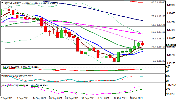 The EURUSD edges lower in early Thursday’s trading, holding in extended consolidation under pivotal Fibo barrier at 1.1671 (38.2% of 1.1909/1.1534 bear-leg) which provided significant headwinds to recovery leg from 1.1524 (Oct 12/13 lows).