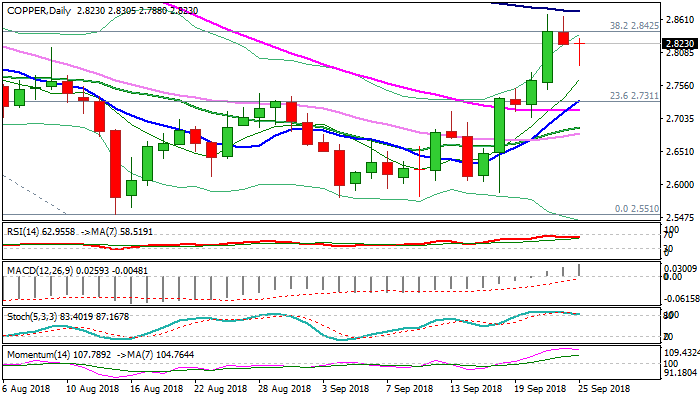 Copper price is holding in the middle of thick daily cloud, with a plenty of space for corrective action towards strong supports at $2.7616 (Fibo 38.2% of $2.5870/$2.8695 upleg) and 2.7280/40 (converged daily Tenkan-sen / Kijun-sen / 50% retracement, which should contain extended dips to keep bulls off higher base at $2.58 zone alive.