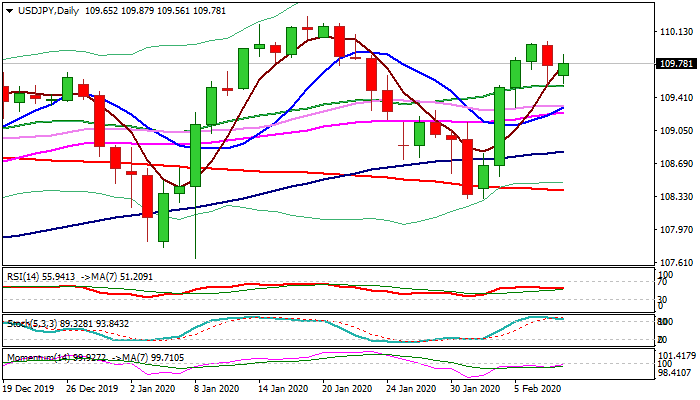 Strongly overbought stochastic on daily chart warns of extended consolidation and possible deeper dips, which need to stay above 109.36 (Fibo 38.2% of 108.31/110.02 rally) to keep near-term bias with bulls.