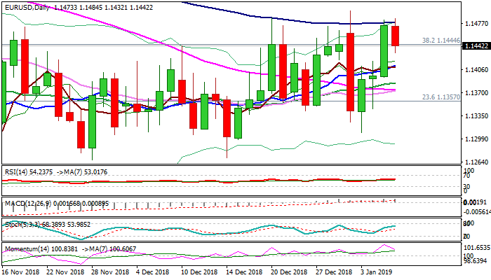 Early Monday’s action is holding in red as the price eased to broken 1.1444 Fibo level, now acting as initial support, which guards pivotal supports at 1.1417/13 (Fibo 38.2% of 1.1309/1.1484 / daily 10SMA).