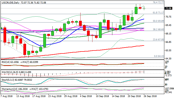 Bulls are taking a breather at $72.77 Fibo barrier (76.4% of $75.34/$64.43 descend, break of which would open way for extension towards $74.67 (10 July high) and key barrier at $75.34 (04 July high), the highest since Nov 2014.