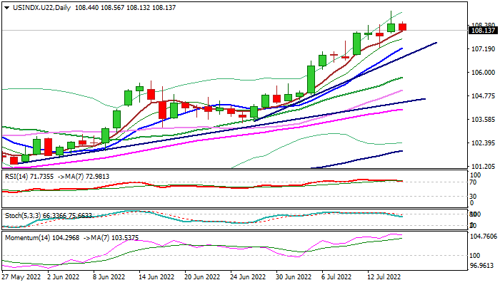 The dollar index is trading just under new highest since Sep 2002, hit on Thursday’s acceleration above 109.00 mark.