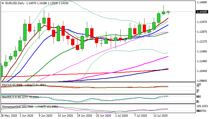 Wednesday’s action left daily candle with long upper shadow that could be seen as initial negative signal for deeper pullback towards (1.1385/72 (Fibo 23.6% of 1.1168/1.1452 / rising 5DMA) and 1.1343/30 (Fibo 38.2% / rising 10DMA).