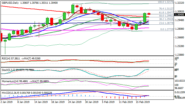 Strong 1.30 support zone (broken 20/200SMA’s / psychological) is expected to hold and keep bulls intact for fresh extension higher, with repeated close above Fibo barrier at 1.3047 to confirm bullish stance and open way towards initial barriers at 1.3112 (Fibo 76.4% of 1.3217/1.2772) and 1.3160 (31 Jan lower high) en-route to 1.3217 target.
