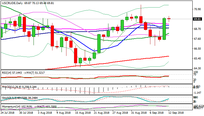 Sustained break above $70 barrier would open way towards key barrier at $71.38 (04 Sep spike high), while cluster of converged daily MA’s (10/55/100) formed strong supports within $69.24/$68.84 zone, which is expected to protect the downside.