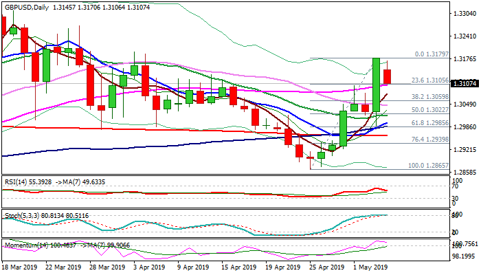 Key supports at 1.3077 (daily cloud base) and 1.3060 (Fibo 38.2% of 1.2865/1.3179) need to hold and keep bullish bias for renewed attack at pivotal barriers at 1.3184/96 (Fibo 61.8% of 1.3381/1.2856 / 3 Apr monthly high) violation of which would boost bullish signal on Friday’s penetration and close within thick weekly cloud.