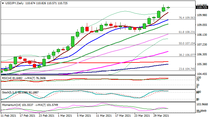 Bulls eye targets at 111.71 (Mar 202 peak and 112.25 (2020 high), break of which would open way for attack at monthly cloud top (112.41), as March rally penetrated the cloud, spanned between 110.51 and 112.41.