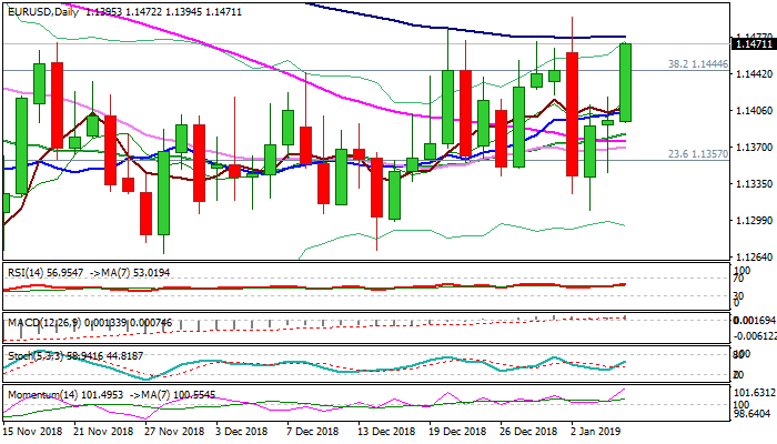 The Euro remains bid in early American session on Monday and establishes above broken 1.1444 pivotal Fibo barrier.