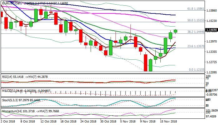 The pair remains in green for the sixth straight day and looks for extension of bull-leg from 1.1215 double-bottom (12/13 Nov) towards targets at 1.1499 (07 Nov spike high) and 1.1515 (Fibo 50% of 1.1815/1.1215 descend / 55SMA).