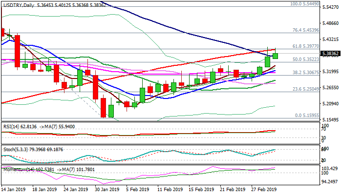 The pair retests key barriers at 5.3964/77 (200SMA / Fibo 61.8% of 5.5449/5.1595) on Monday, in attempts to extend Feb’s 3.3% advance.