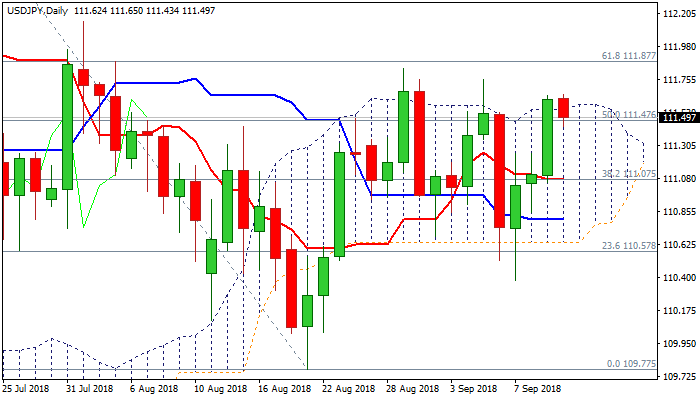 Dip-buying scenario is expected to remain favored while converged 10/55SMA’s (111.20) hold, with bullish scenario requiring repeated close above cloud top to open way for test of next pivotal barrier at 111.87 (Fibo 61.8% of 113.17/109.77 descend).