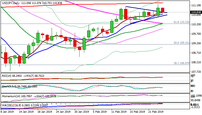 The pair trades near 2019 high at 111.23 following Monday’s rally which generated bullish signal on close above triangle resistance (110.86) and fresh probes above 111 barrier.
