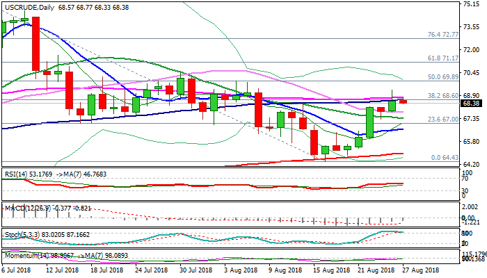 WTI oil price is holding within tight range on Monday and struggling at strong barriers at $68.60 zone (Fibo 38.2% of $75.34/$64.43 descend / converging 10/55SMA’s) which were cracked on Friday, but without clear break.
