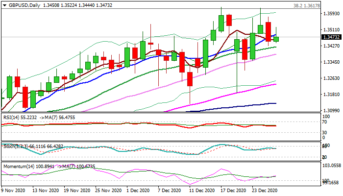 Near-term action remains congested under new 2 ½ year highs (1.3624/18, posted on 17 / 24 Dec respectively) as bulls faced strong headwinds at key Fibo resistance at 1.3618 (38.2% of 1.7189/1.1409, 2014/2020 fall).