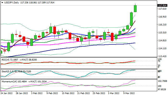 The dollar remains well supported by uncertainty over the war in Ukraine that keeps investors in the safety, with expectations for Fed rate hike on Wednesday, adding to positive sentiment, while divergence between the Fed and BoJ, as Japan’s central bank is likely to stay on hold for some time, prompting stronger selling of yen.