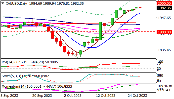 Gold keeps firm bullish tone and is on track for third weekly gain though the action remains capped just under psychological $2000 barrier.