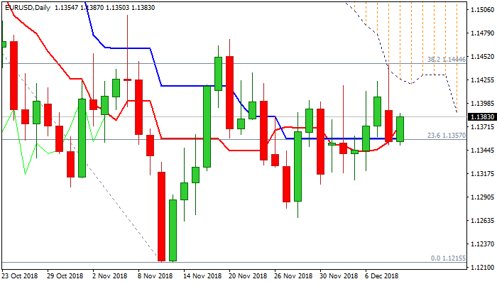 The Euro bounces from lows at 1.1350 (Mon/today) posted after upside rejection at strong 1.1440 resistance zone (daily cloud base / Fibo 38.2% of 1.1815/1.1215 descend / falling 55SMA).