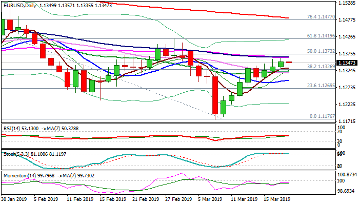 Overall picture remains positive and favors final attack at 1.1363/73 pivots (55/100SMA’s / 50% of 1.1569/1.1176), clear break of which would expose thickening daily cloud (1.1393/1.1413).