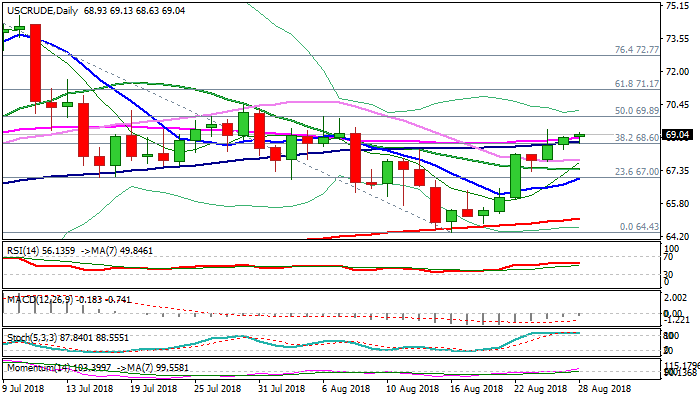 WTI oil maintains positive tone and extends higher after Monday’s close above $68.60 pivot (Fibo 38.2% of $75.34/$64.43 descend, reinforced by converged 10/55SMA’s) generated bullish signal.