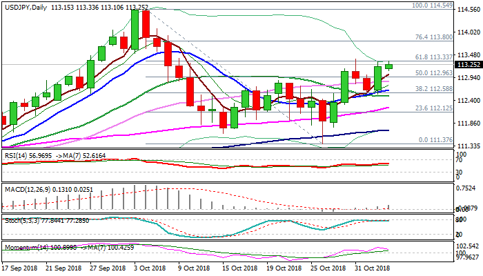 The pair maintains positive tone at the beginning of the week and retested key barrier at 113.33 (Fibo 61.8% of 114.54/111.37) which repeatedly capped upside attempts last week.