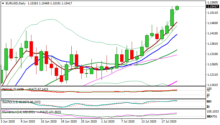 The Euro is holding near new 2020 high (1.1546) early Wednesday’s trading, following 0.7% advance on Tuesday (the biggest one-day gain since 4 Jun) and close above previous year’s high (1.1495).