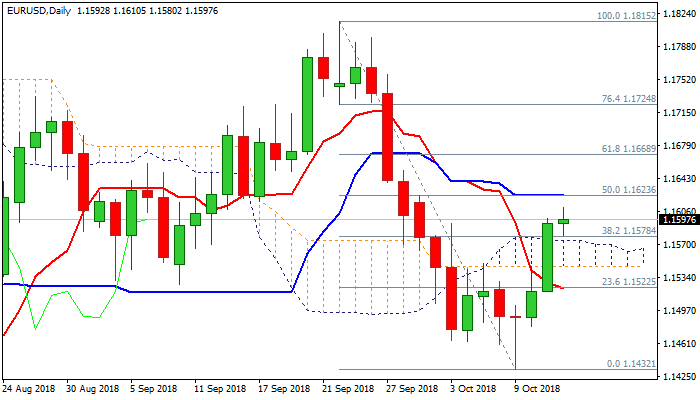 The pair is on track for bullish weekly close (after two weeks in red) as fresh acceleration higher penetrated thick weekly cloud (cloud base lays at 1.1578), which provides further positive signals.