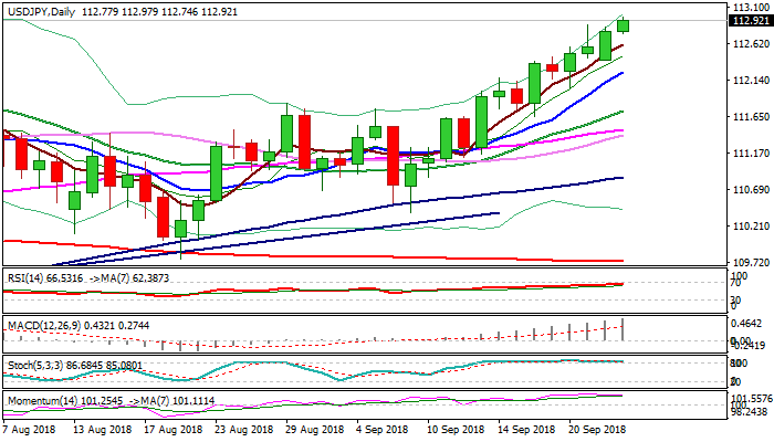 The dollar extended advance against yen and hit new over two-month high on Tuesday. Extension of Monday’s strong rally, which neutralized risk of pullback after bulls were rejected at 112.87 last Friday, pressures psychological 113.00 barrier and focuses key short-term resistances at 113.17/22/30 (19 July high / weekly 200SMA / Fibo 61.8% of 118.66/104.63 fall).