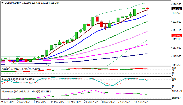 Daily tech show fading bullish momentum and south-heading stochastic after reversing from overbought territory that adds to signals of consolidative / corrective phase, while weekly studies are also overbought, as the pair is on track for the sixth consecutive bullish weekly close, but so far without clearer signals of reversal.