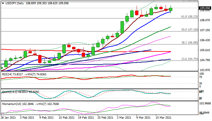 Rising 10DMA (108.76) offers solid support, ahead of key levels at 108.33/23 (Mar 10 low / broken Fibo 61.8%), loss of which would put bulls on hold and signal deeper pullback.