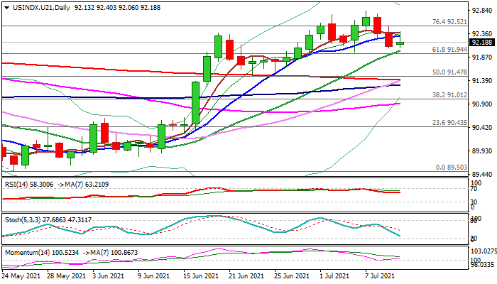 Pivotal supports at 92.00 zone (rising 20DMA / Fibo 23.6% of 89.50/92.82) need to hold to keep bulls intact, while break lower would weaken near-term structure and risk dip towards key 91.50/40 support zone (200DMA / Fibo 38.2% of 89.50/92.82).