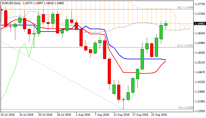 Monday’s penetration and close within daily cloud (spanned between 1.1658 and 1.1750) was bullish signal, with structure supported by strong momentum and multiple bull-crosses of daily MA’s.