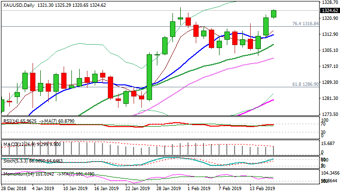Spot gold rose on Monday, in extension of last Thu/Fri rally and pressures 2019 high at $1326, posted on 31 Jan (the highest since 25 Apr 2018).