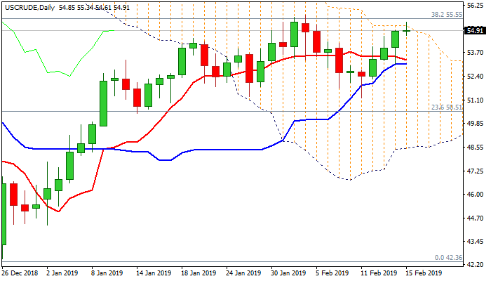 Bullish daily techs remain supportive for renewed attack at $55.55 Fibo barrier and $55.73 (2019 high posted on 4 Feb), break of which would expose falling 100SMA ($57.24).