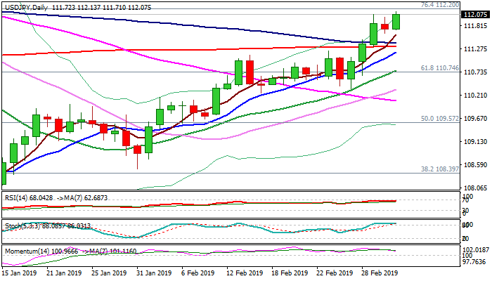 Although fresh bulls probed again above 112 handle, key barriers at 112.20/31 (Fibo 76.4% of 114.54/104.59 / 200WMA) remain intact, but under increasing pressure.