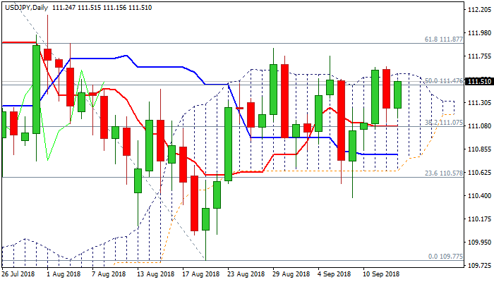 Cloud top (111.58), recent upside rejections (111.75/82) and Fibo 61.8% of 113.17/109.77 descend (111.87) mark a cluster of barriers that need to be broken to signal continuation of bull-phase from 107.77 (21 Aug low).
