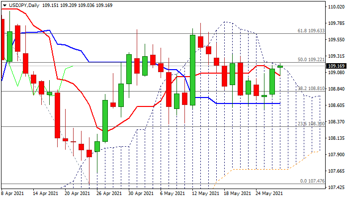 The dollar maintains positive near-term tone following Wednesday’s 0.34% jump (the biggest one-day gains since May 12) and probes through daily cloud top 109.16, as Thursday’s action is establishing above 109 mark.