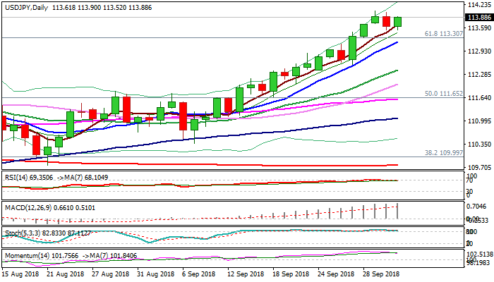 Firm bullish stance remains intact above broken key barriers at 113.30/18 (Fibo 61.8% of 118.66/104.63 / weekly 200SMA) for extension towards targets at 114.73 (05 Nov 2017 high) and