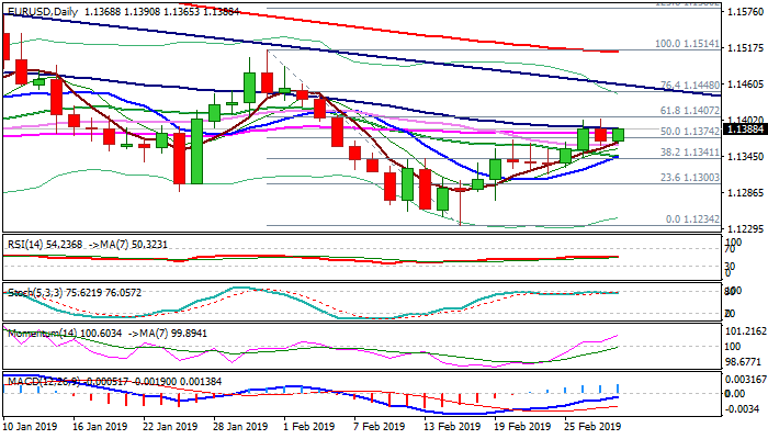 Bulls repeatedly failed to close above barriers at 1.1389/92 (100SMA / daily cloud base) and attack pivotal resistance at 1.1407 (Fibo 61.8% of 1.1514/1.1234), break of which would generate bullish signal for continuation of recovery rally from 1.1234 (15 Feb).