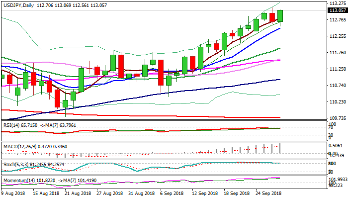 Bounce from daily low at 112.56, posted in early Europe, accelerated after upbeat US data and probes again above 113.00, for renewed attack at key 113.17/30 barriers (19 July high / Fibo 61.8% of 118.66/104.63 descend, reinforced by weekly 200SMA).