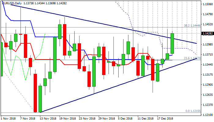 Fresh bullish acceleration pressures key barrier at 1.1444 (Fibo 38.2% of 1.1815/1.1215) where rallies were already rejected twice (19 / 10 Dec).