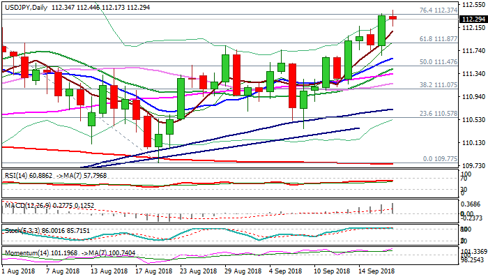 Dips are expected to find ground at 111.87/61 zone (broken Fibo 61.8% of 113.17/109.77 descend / rising 10SMA) to keep bulls in play for possible extension towards key barriers at 113.17/24 (19 July high / weekly 200SMA).
