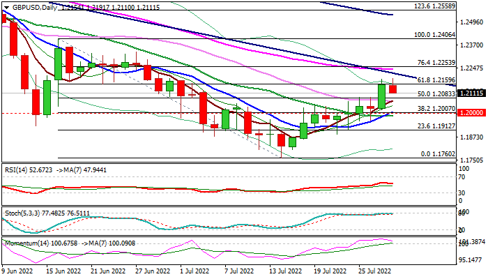 The action is struggling at pivotal Fibo resistance at 1.2159 (61.8% of 1.2406/1.1760), despite Wednesday’s 1.07% rally and threatening of recovery stall here that would complete a bull-trap and increase downside risk.