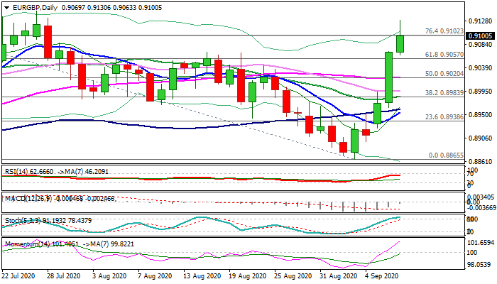 Bulls eye 27 July high at 0.9147, which guards 29 June high at 0.9175, but need a verification on today’s close above cracked Fibo barrier at 0.9102 (76.4% of 0.9175/0.8865).