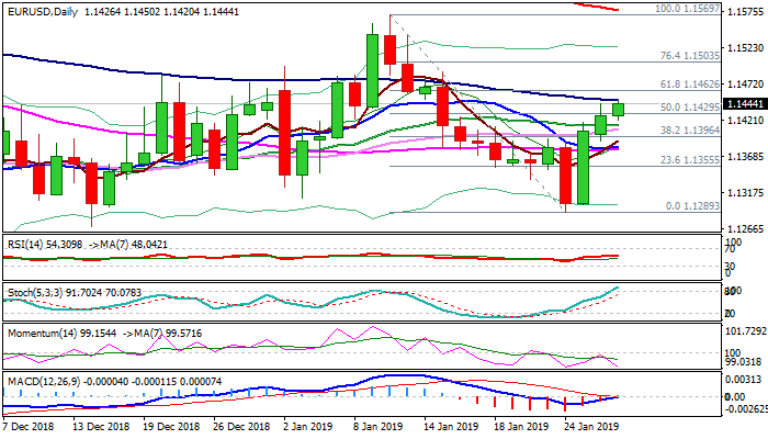 Bullish scenario requires close above 100SMA and violation of next pivotal barrier at 1.1462 (Fibo 61.8% of 1.1569/1.1289) to signal extension of bull-leg from 1.1289 (24 Jan low).