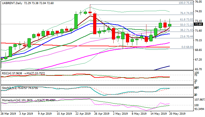 Fresh concerns weighed on oil price which struggles at key Fibo barrier at $73.02 (61.8% of $75.60/$68.84) for the third straight day.