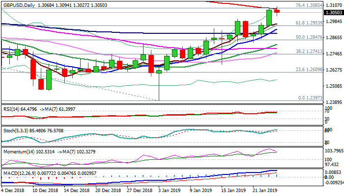 Broken psychological 1.30 barrier (also highs of 17/18 Jan) acts as solid support, where extended downticks are expected to find ground.