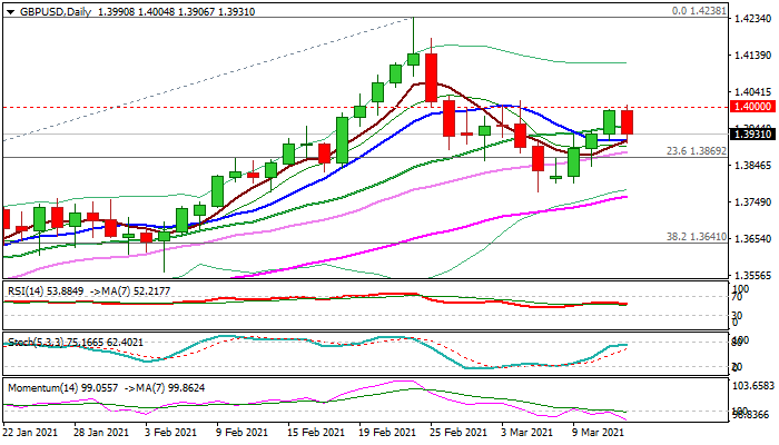 Cable fell one full figure in European trading on Friday, following repeated rejection at psychological 1.40 barrier, deflated by stronger dollar on rise of US yields, with UK economy’s contraction in January (although less then expected) contributed to pound’s fresh weakness.