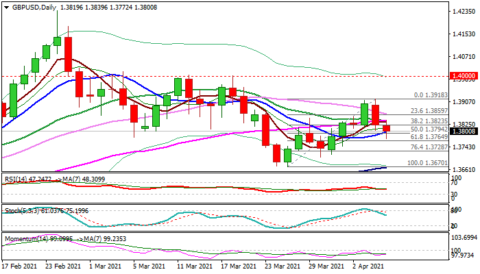 Fresh weakness cracked pivotal support at 1.3794 (50% retracement of 1.3670/1.3918 / 10DMA) with today’s close below here to add to negative signals and keep near-term bias with bears.