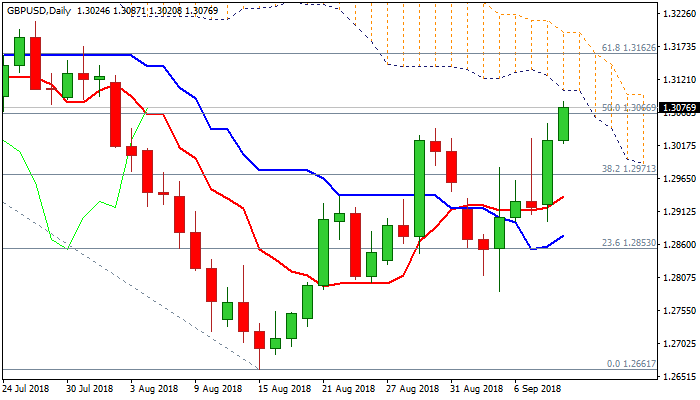 Extension of Monday’s 0.8% advance which generated bullish signals on close above falling 55SMA and former high of 30 Aug (1.3043), hit new high at 1.3087, the highest since 02 Aug, on probe through 1.3066 barrier (50% of 1.3472/1.2661) and eye the base of falling daily cloud at 1.3104, as the cloud is thin and expected to attract further advance.